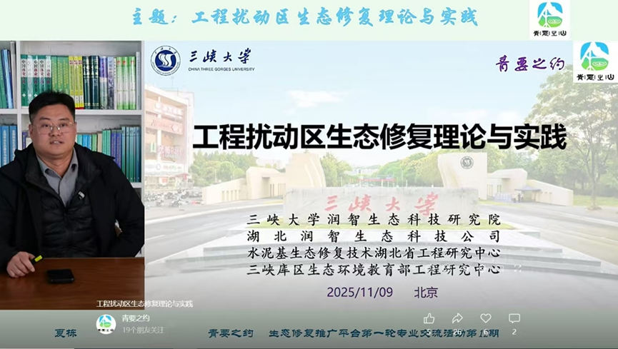 2025年11月9日18:50,“靑要之約”生態修復推廣平臺第一輪專業交流活動的第12期如約在云端開啟,并取得圓滿成功。本期活動聚焦當前生態修復領域的重點與難點——工程擾動區生態修復,特邀我司在該領域具有深厚理論積淀和豐富項目經驗的夏棟總工擔任主講嘉賓。夏棟總工以《工程擾動區生態修復理論與實踐》為題,為行業同...